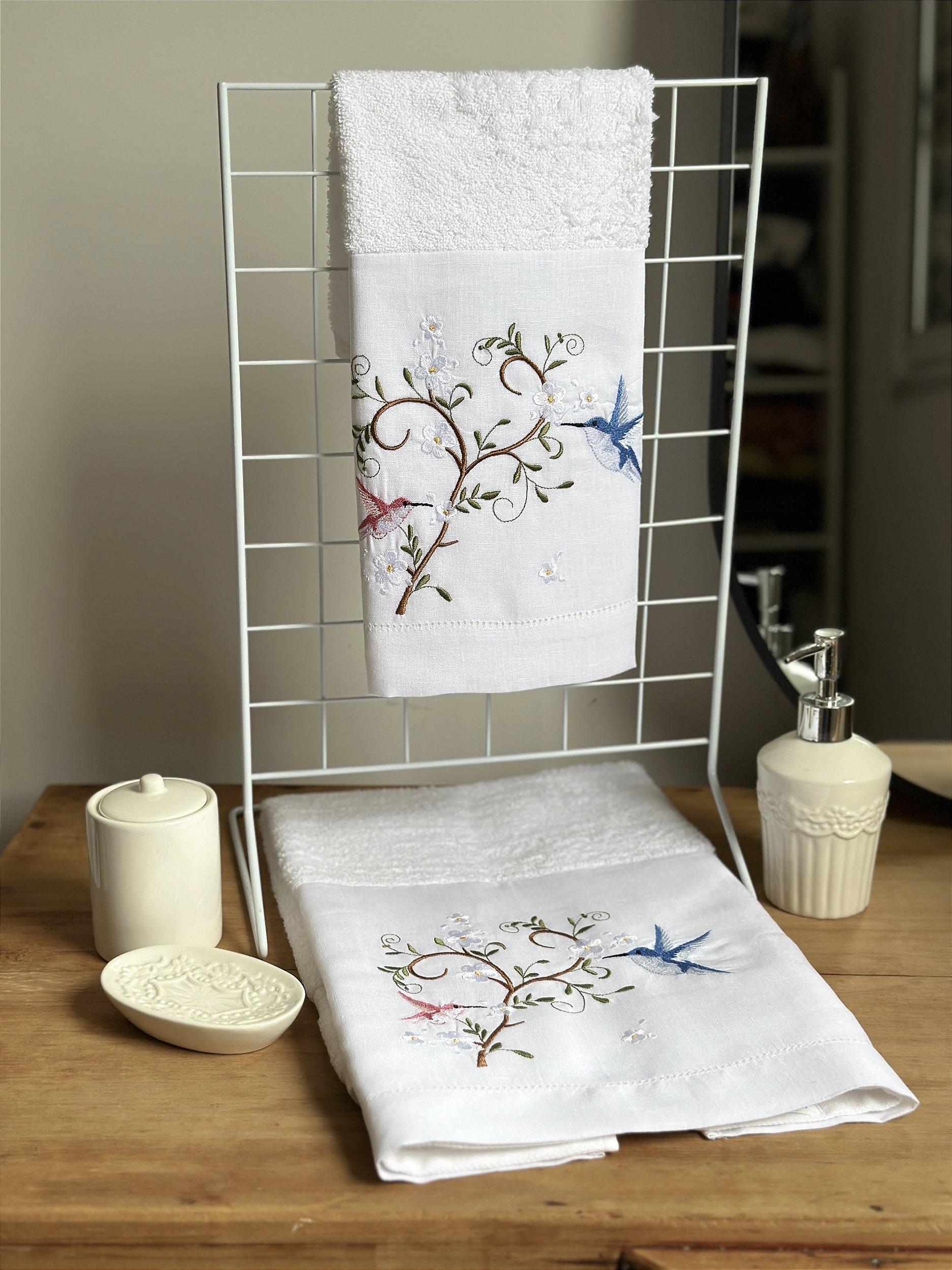 CONJUNTO TOALHA DE MÃO E ROSTO BEIJA FLOR - LINHO BRANCO