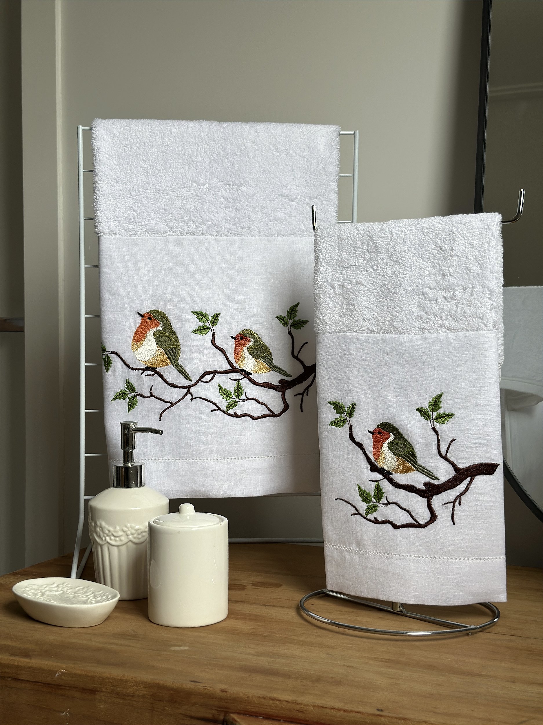 CONJUNTO TOALHA DE MÃO E ROSTO PÁSSARO LARANJA - LINHO BRANCO