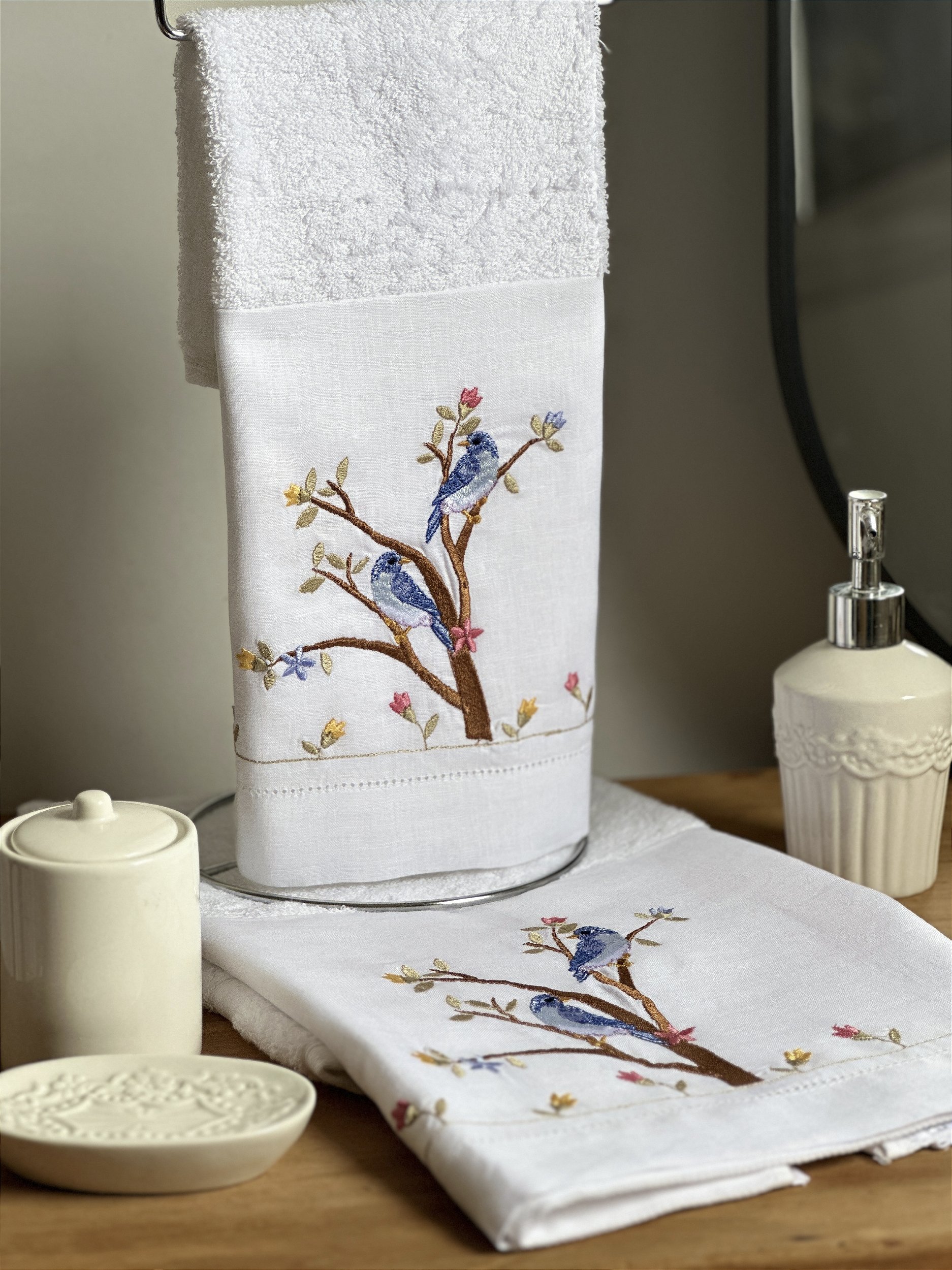 CONJUNTO TOALHA DE MÃO E ROSTO PASSAROS AZUIS